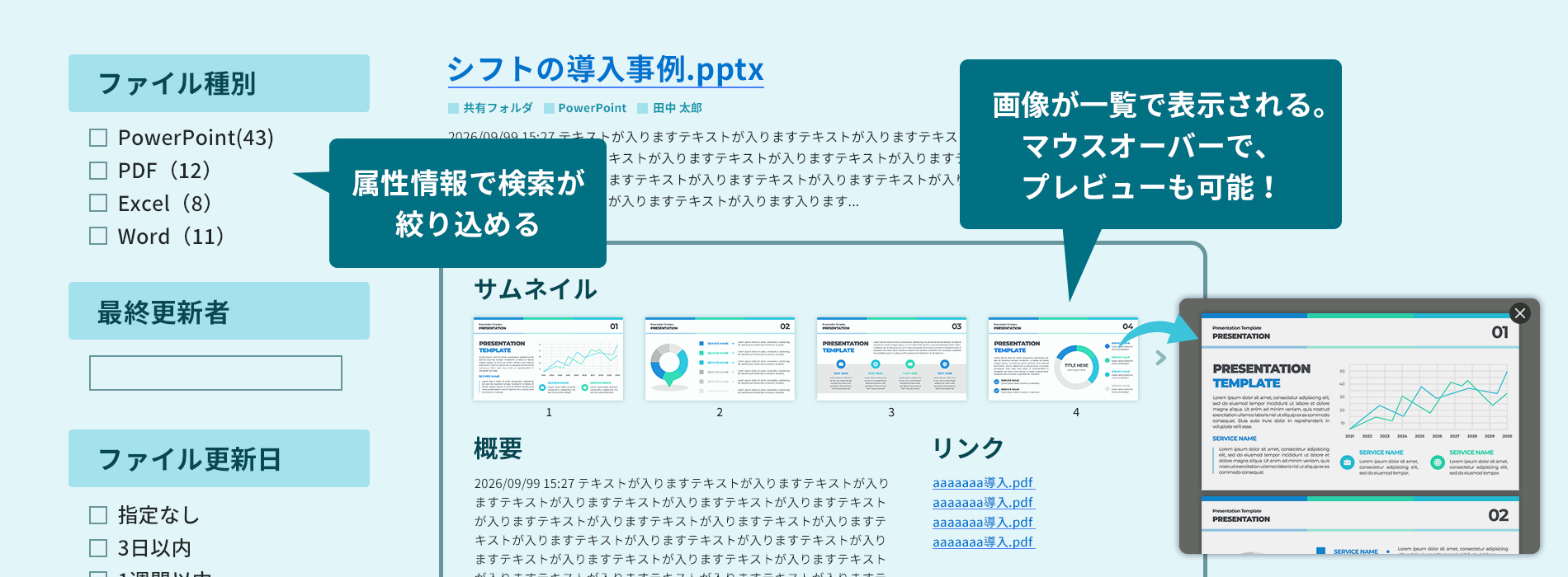 Neuron ESなら、PowerPointのスライドやPDFの表紙が画像で一覧表示され、マウスを乗せればプレビューもできる。直感的に「これだ」と分かります。 また、企業内の検索では「いつのファイルか」「誰が作ったか」「ExcelかPDFか」といった属性情報が重要です。これらの条件でサクサク絞り込める機能も、ユーザーのストレスを大幅に軽減しています。