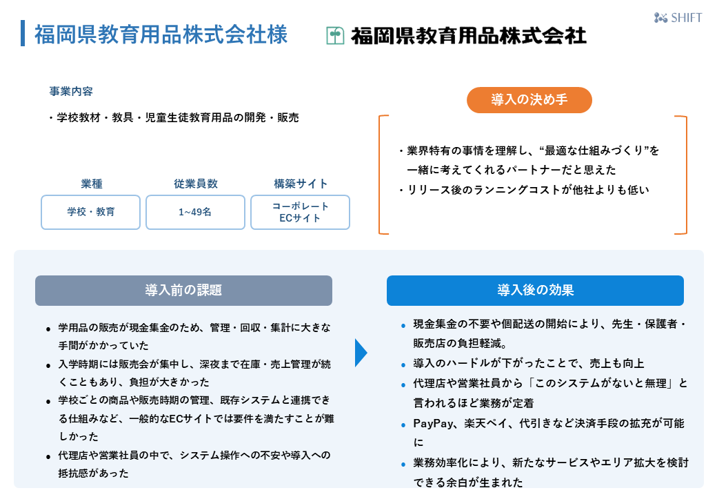 そんな時に出会ったのがシフトの久原さん。学用品販売業界特有の事情を理解してくれ、“学校用品販売に適した仕組み”を一緒に考えてくれるパートナーだと思えました。また初期費用はかかるものの、リリース後のランニングコストが他社より低かった点も決め手です。