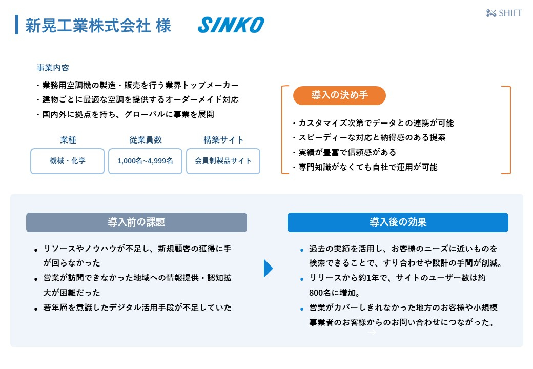 SINKOダイレクトが新規のお客様からの問い合わせや商談につながったということをお伺いし、大変嬉しく思います。今後も引き続き新晃工業様のお力になれるよう尽力させていただきます。